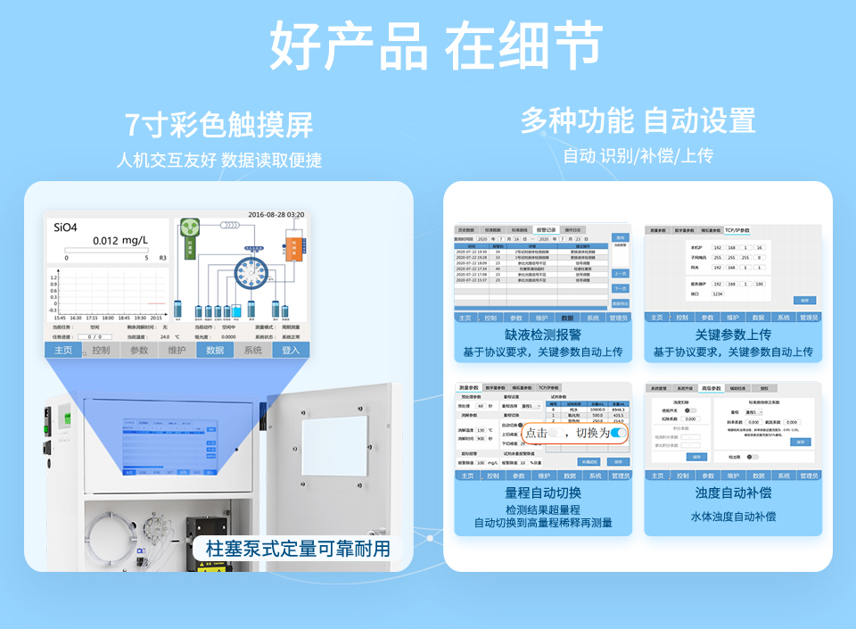 產(chǎn)品描述:該設(shè)備應該領(lǐng)域廣泛:工業(yè)企業(yè)廢水自動監(jiān)測、醫(yī)療單位廢水自動監(jiān)測、城鎮(zhèn)污水處理廠進出水自動監(jiān)測、排污河、渠水質(zhì)自動監(jiān)測、實驗室及自動監(jiān)測站廢液廢水自動監(jiān)測、城市小流域、內(nèi)河水質(zhì)自動監(jiān)測、地表飲用水源地水質(zhì)自動監(jiān)測、城鎮(zhèn)供水水質(zhì)自動監(jiān)測等