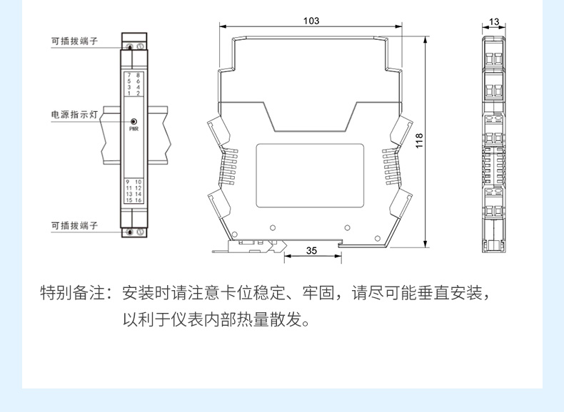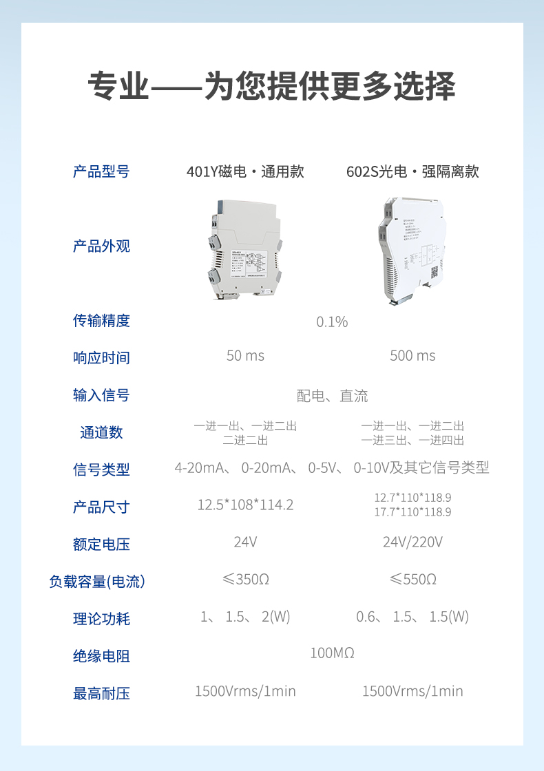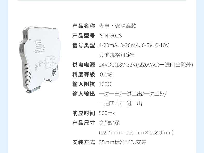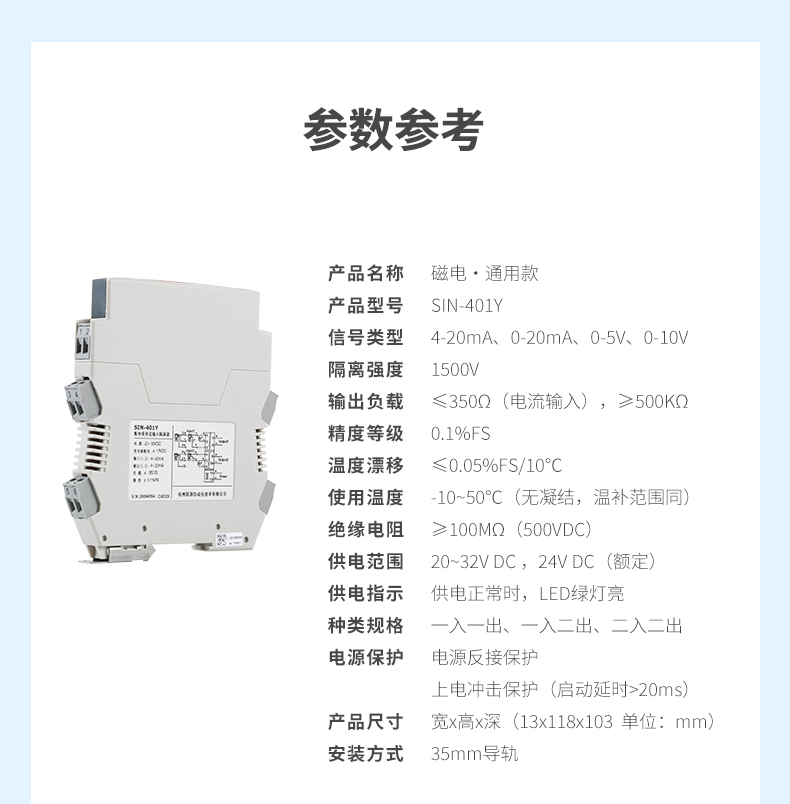 產(chǎn)品描述:信號(hào)隔離器是一種信號(hào)隔離裝置,將輸入單路或雙路電流或電壓信號(hào),變送輸出隔離的單路或雙路線性的電流或電壓信號(hào),并提高輸入、輸出、電源之間的電氣隔離性能。