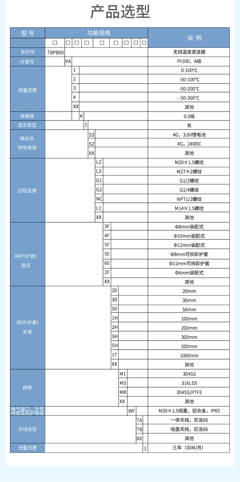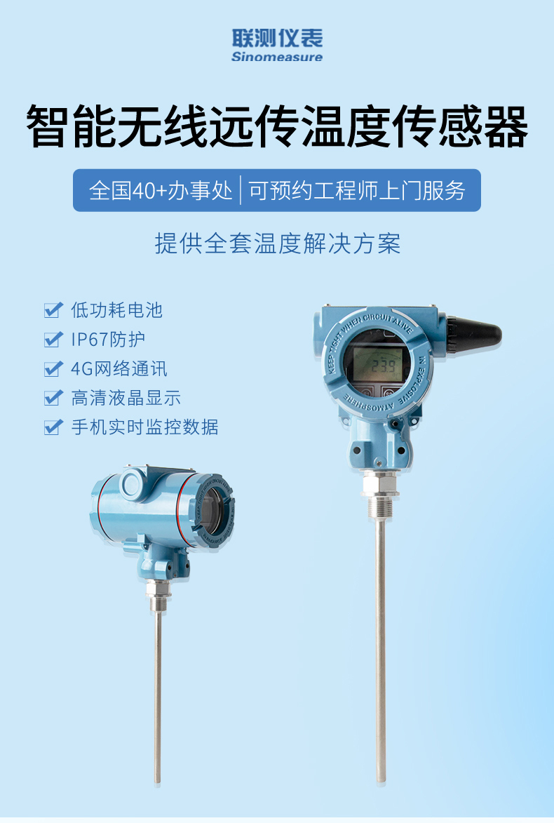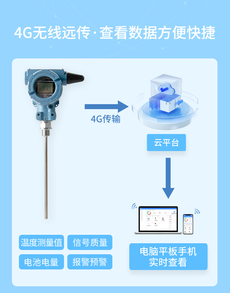 產(chǎn)品描述:無線溫度變送器是基于 4G 無線通訊網(wǎng)絡(luò)使溫度的測量、變送、上報為一體的低功耗智能儀表。產(chǎn)品采用 Pt100 溫度傳感器作為敏感元件,高精度信號調(diào)理電路,低功耗電池電源管理,豐富的 LCD 顯示界面于一體,周期性上報溫度測量值、電池電量、信號質(zhì)量等數(shù)據(jù),并且能夠在溫度超出設(shè)置范圍時及時報警,提前預警故障隱患。