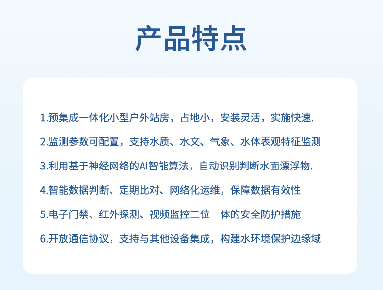 產(chǎn)品描述:為便捷監(jiān)測水環(huán)境,iWater X-MiniStation小型水站采用預(yù)集成一體化微型戶外機(jī)柜設(shè)計(jì),包括采水系統(tǒng)、預(yù)處理配水系統(tǒng)、分析儀器系統(tǒng)、輔助系統(tǒng)、安防系統(tǒng)、控制與數(shù)據(jù)服務(wù)系統(tǒng)、Al智能分析系統(tǒng)、集成機(jī)柜等,具有0.5平方米、1平方米、2平方米等規(guī)格,可實(shí)現(xiàn)水質(zhì)、水文、氣象等參數(shù)的自動(dòng)測量,以及水面漂浮物的識(shí)別,并進(jìn)行結(jié)構(gòu)化、非結(jié)構(gòu)化數(shù)據(jù)的管理與服務(wù)。依據(jù)流域河網(wǎng)水系特點(diǎn),在河道采用iWater X-MiniStation系列微型水站進(jìn)行網(wǎng)格化布點(diǎn)監(jiān)控,結(jié)合信息化技術(shù),以大數(shù)據(jù)支撐水環(huán)境評(píng)價(jià)與預(yù)警、