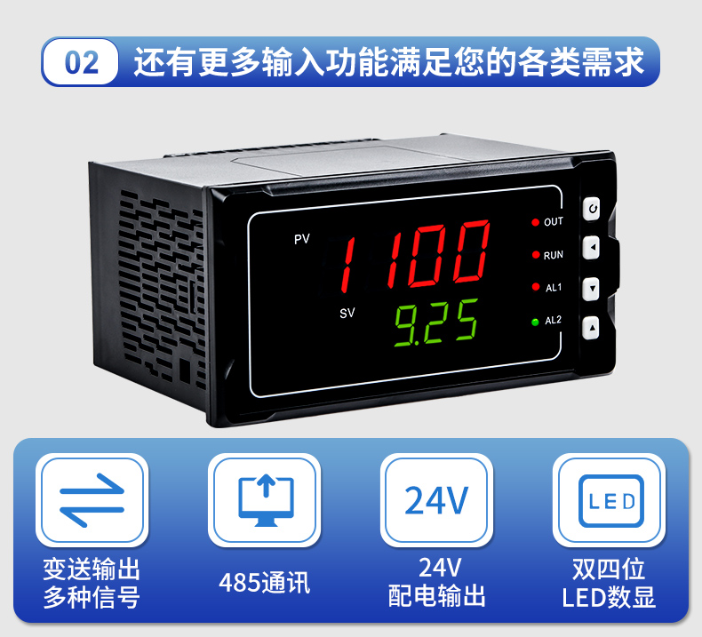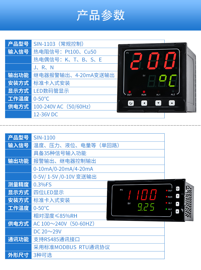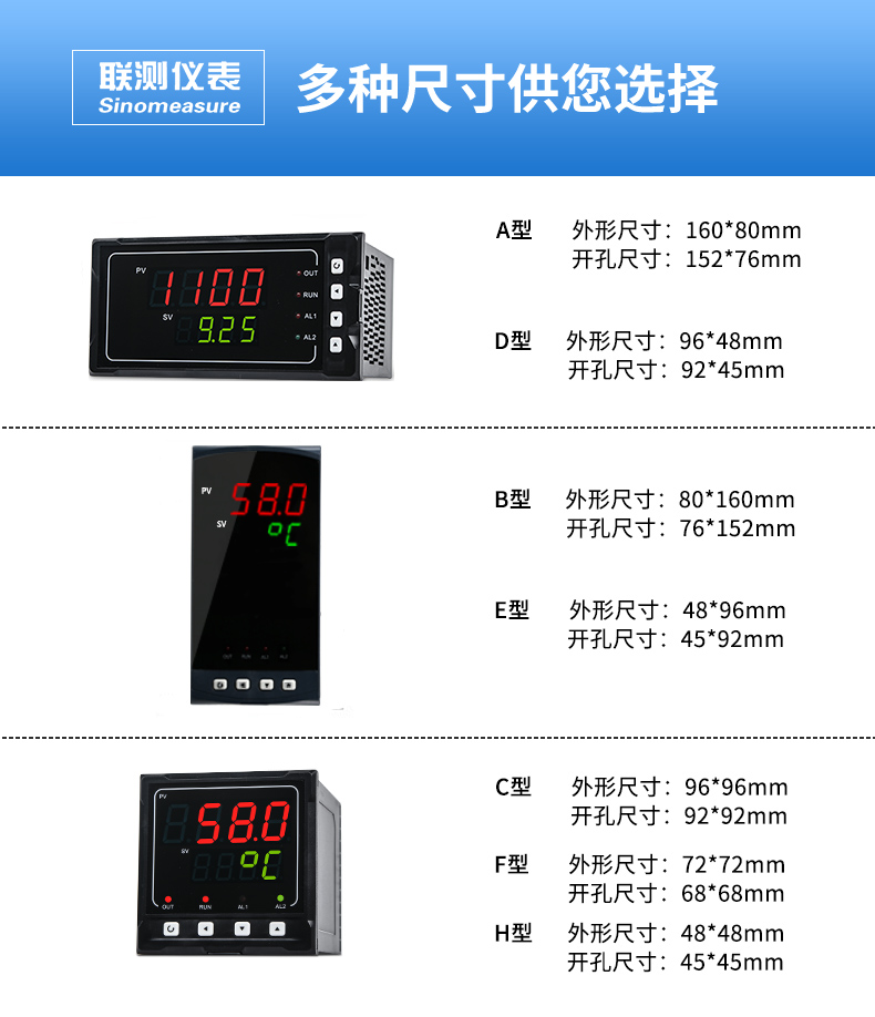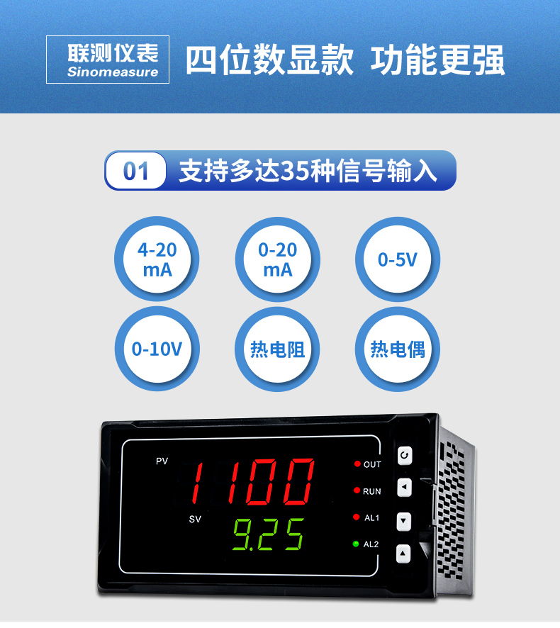 產(chǎn)品描述:聯(lián)測SIN-1100數(shù)顯表(簡易型),傻瓜式操作,0.3級測量精度,7款外型尺寸,雙四位LED顯示,可支持熱電偶、熱電阻、電壓(可開方運算)、電流(可開方運算)及變送器輸入,適用溫度、壓力、流量、液位、濕度等工業(yè)過程量的監(jiān)測。