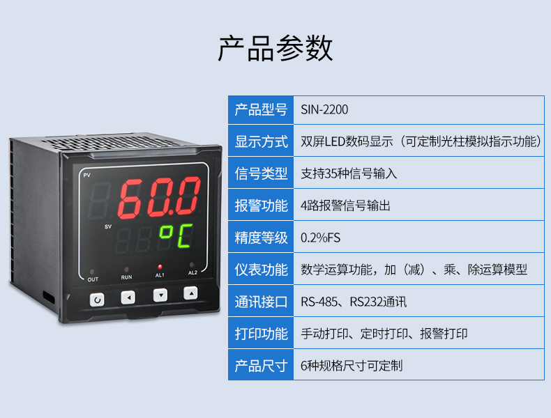 產(chǎn)品描述:SIN-2200雙回路數(shù)字顯示控制儀采用了表面貼裝工藝,全自動貼片機生產(chǎn),具有很強的抗干擾能力。本儀表支持多種信號類型輸入,可與各類傳感器、變送器配套使用,實現(xiàn)對溫度、壓力、液位、速度、力等物理的測量顯示,帶報警控制、模擬變送輸出、485/232 通訊等輸出功能,帶雙屏數(shù)碼管顯示,可自由設定上、下窗口顯示內(nèi)容,可訂制數(shù)學運算功能,可針對兩路測量信號進行加、減、乘、除運算,其適用范圍非常廣泛。
