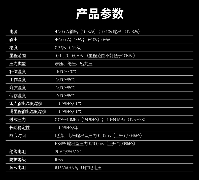 產品描述:擴散硅壓力變送器選用進口高精度、高穩(wěn)定性壓力 敏感芯片。敏感芯片采用先進的微機械刻蝕加工工藝, 通過在硅片上擴散四個高精度電阻,從而形成惠斯通電 橋。由于壓阻效應,四個橋臂電阻的阻值發(fā)生變化,電 橋失衡,敏感元件輸出一個對應壓力變化的電信號。輸 出的電信號通過 24 位 AD 數字芯片的放大和非線性矯正 的補償,產生與輸入壓力成線性對應關系的電壓、電流 信號。CN6