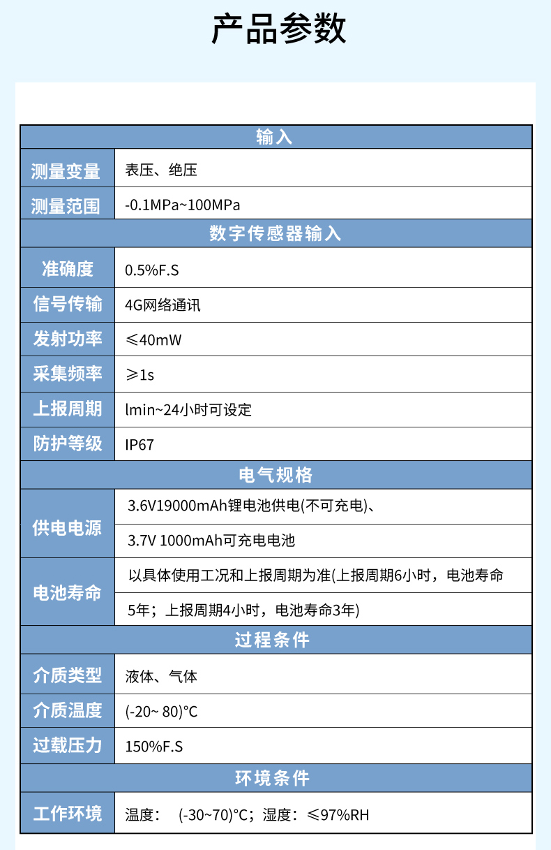 產(chǎn)品名稱: PM800無線壓力傳感器 4G通訊 電池供電 耐壓100MPA 0.5%精度