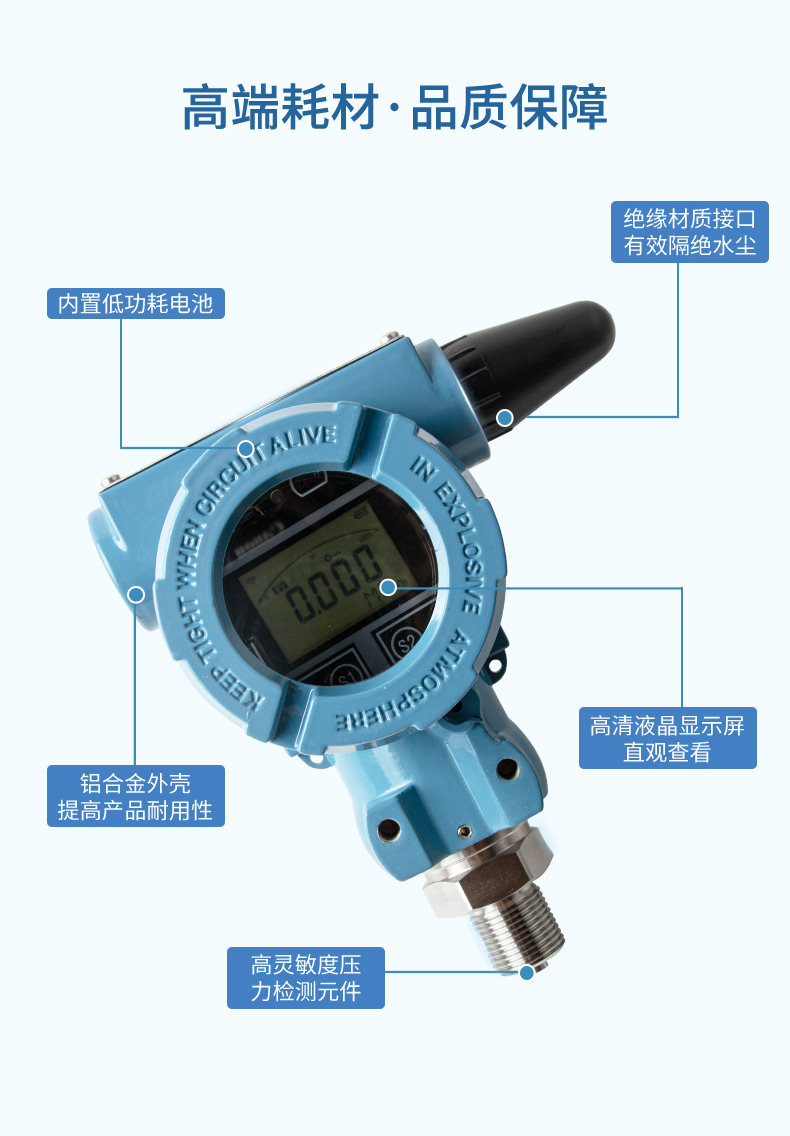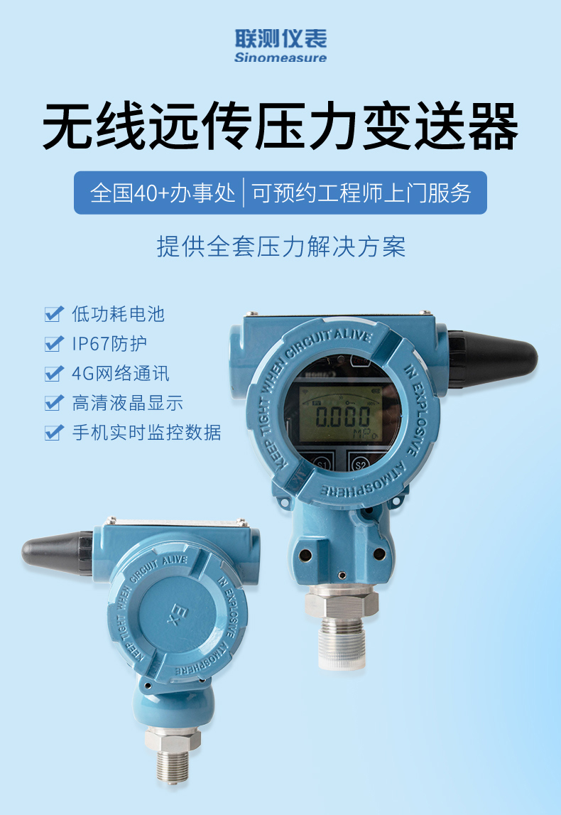 產(chǎn)品描述: 無線壓力變送器是基于 4G 無線通訊網(wǎng)絡(luò)使壓力的測量、變送、上報為一體的低功耗智能儀表。產(chǎn)品集成高靈敏度壓力檢測元件,高精度信號調(diào)理電路,低功耗電池電源管理,豐富的 LCD 顯示界面于一體,周期性上報壓力測量值、電池電量、信號質(zhì)量等數(shù)據(jù),并且能夠在壓力超出設(shè)置范圍時及時報警,提前預(yù)警故障隱患。