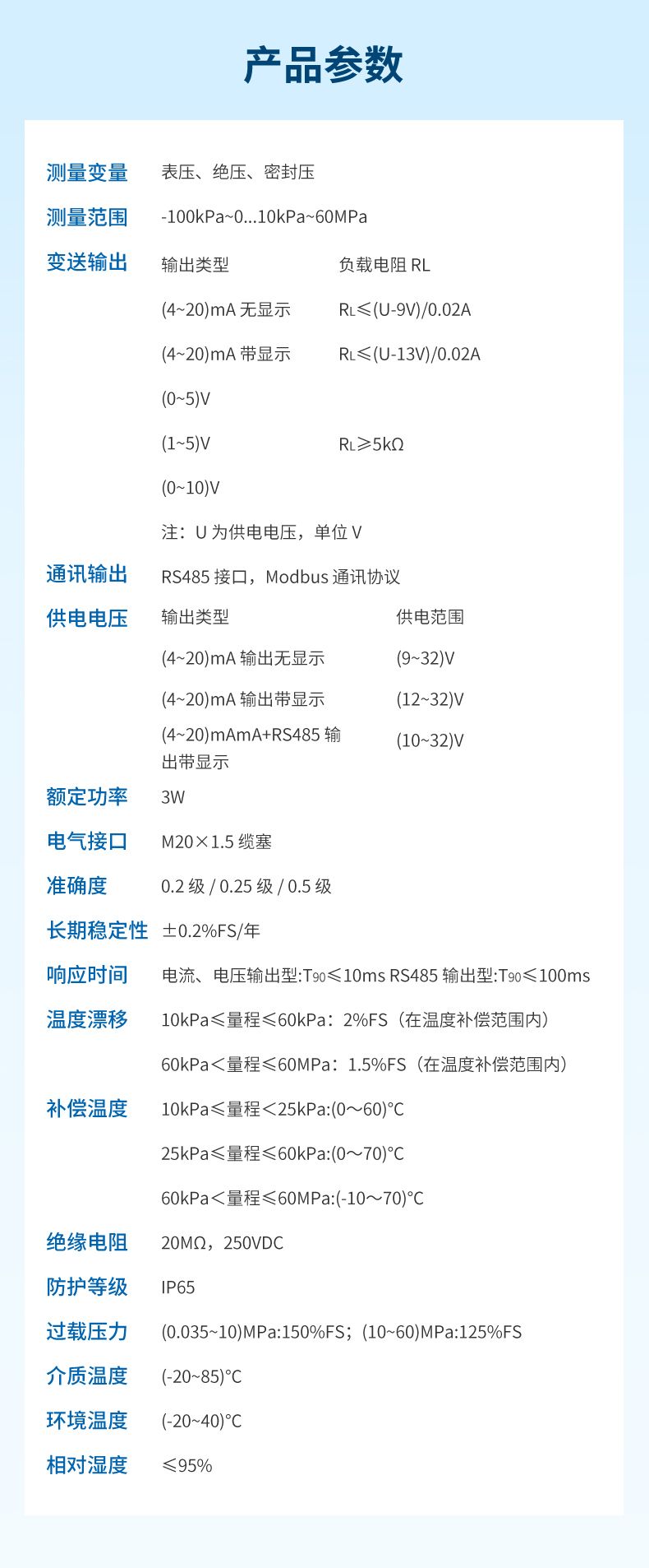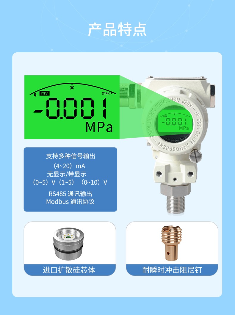 產(chǎn)品描述: 壓力變送器選用進口高精度、高穩(wěn)定性的擴散硅芯體,傳感器內采用電子放大器組成,將測量的電信號轉換成標準信號(電流、電壓、RS485)輸出。可以直接與計算機接口卡、控制儀表、智能儀表或 PLC 等方便相連。