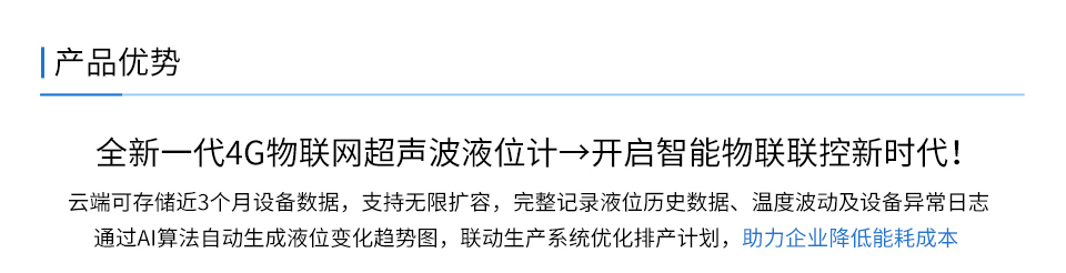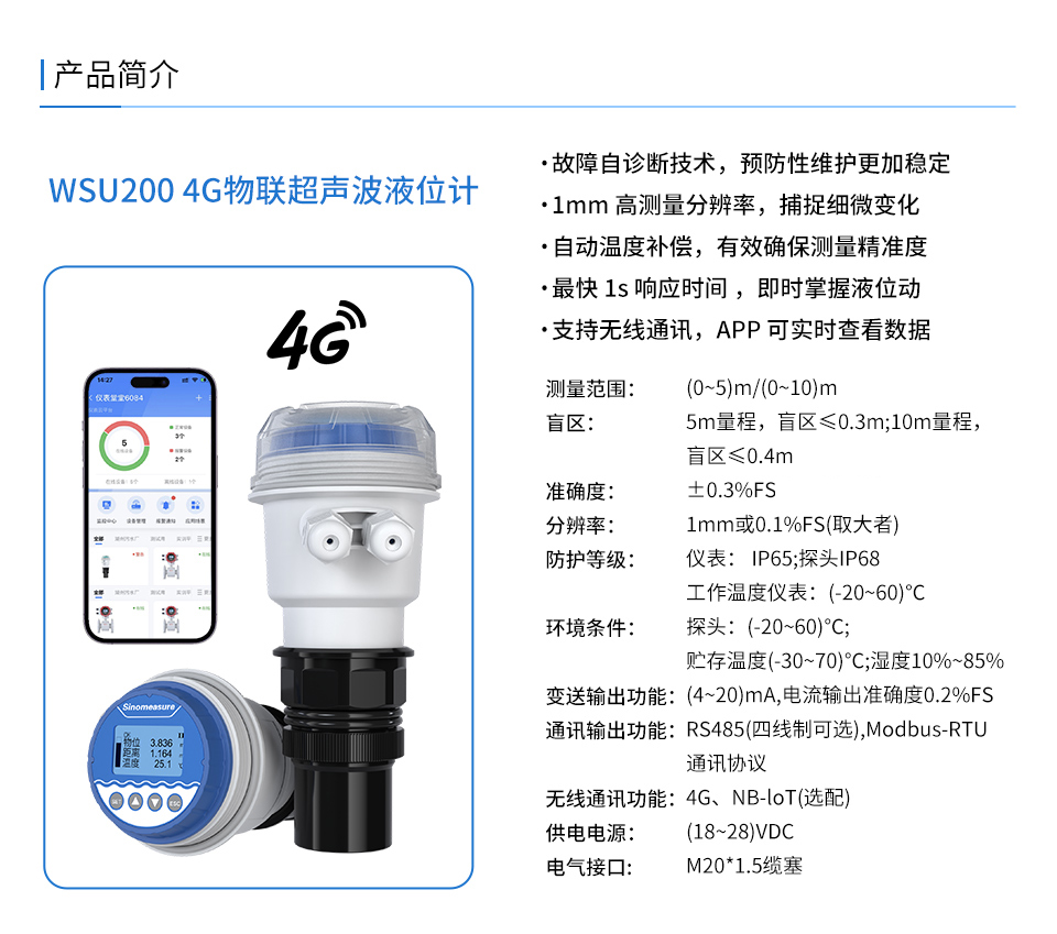 產(chǎn)品描述:WSU-200 4G物聯(lián)超聲波液位計具有高可靠性、高性價比、易安裝維護的液位/物位測量儀器,可廣泛用于各種液體和固體物料高度的測量。本產(chǎn)品可選配 NB-IoT 無線通訊功能,用戶可在儀表云平臺進行數(shù)據(jù)查看和遠程監(jiān)控。常見的應(yīng)用工況,如市政、化工、儲運等工業(yè)環(huán)境中的河流、水池、儲罐等液位測量。咨詢熱線:400-185-1718