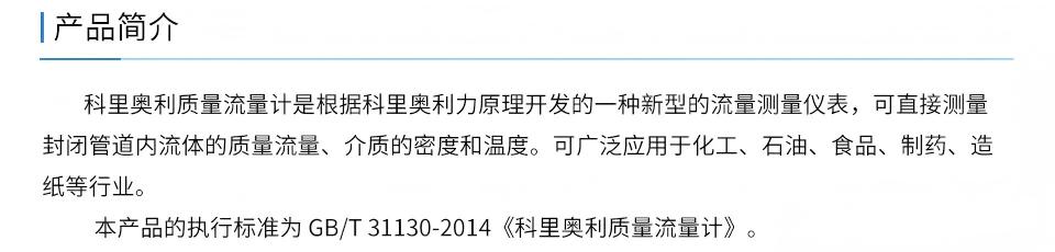 產(chǎn)品描述:聯(lián)測FCC300科里奧利質(zhì)量流量計是根據(jù)科里奧利力原理開發(fā)的一種新型的流量測量儀表,可直接測量封閉管道內(nèi)流體的質(zhì)量流量、介質(zhì)的密度和溫度??蓮V泛應(yīng)用于化工、石油、食品、制藥、造紙等行業(yè)。咨詢熱線:400-185-1718